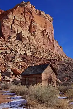 The district comprises a former Mormon agricultural settlement that was active from 1895 to 1947. It includes what remains of the town of Fruita. The Leo R. Holt House, oldest in Fruita, was built in 1895 and the Fruita schoolhouse in 1896. Along with other scattered structures from the original settlement, the district also includes the 1940 ranger station, built for what was then Capitol Reef National Monument in the National Park Service Rustic style and constructed by the Civilian Conservation Corps. Later development included the Mission 66 park visitor center.[3]