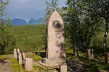 The gravestone in Nikkaluokta with the Kebnekaise massif and Tolpagorni in the background.