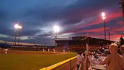 For a time in the 1950s, Kiger Stadium was even turned into an auto racing track.[1] Through the years Kiger has seen it all, and in 2011 welcomed the new Klamath Falls Gems of the West Coast League. The Gems gave Klamath Basin families another reason to visit Kiger Stadium, and the success of the Gems and the WCL have brought many improvements to Kiger, without losing the charm of the original park. (The current Gems now play in the Great West League.)