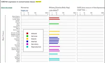 Expression profile of FAM214A found in normal human tissue, as shown in GeneCards.