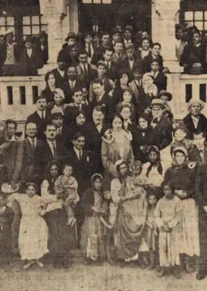 In July 1934, the UGRR entered Șerboianu's fief in Târnava-Mică County, opening its own chapter with a festivity on Liberty field.[3][33] In October, the Union organized an international congress of the Gypsies.[34][35][36] Held out in the open in one of Bucharest's Romani suburbs, it reportedly used the slogan "Gypsies of the World unite", calling on all nomads to "organize themselves into a race-conscious and stable community." Its organizers promised that the Romani community had entered the age of "national dignity".[34] Lăzurică was then tasked with representing the General Union at any future international meeting.[37] Both he and Șerboianu were members of the Gypsy Lore Society,[38] which, by 1935, was recognizing him as the only known Romani writer.[6]