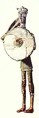 Still in the time-frame of the Prenuragic age, but in this case during the Eneolithic period, there is a remarkable production of "Laconi-type" statue-menhirs or statue-stelae, assigned to the Abealzu-Filigosa culture and characterized by a uniform tripartite scheme encompassing, from top to bottom: a stylized T-shaped human face; the depiction of the enigmatic capovolto (the capsized) in the kind of trident capovolto; and a double-headed dagger in relief.[11][20]