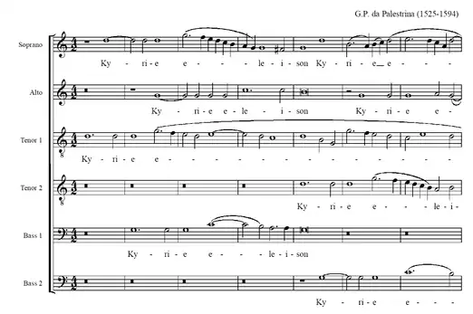 Palestrina left hundreds of compositions, including 105 masses, 68 offertories, at least 140 madrigals and more than 300 motets. In addition, there are at least 72 hymns, 35 magnificats, 11 litanies, and four or five sets of lamentations.[3] The Gloria melody from Palestrina's Magnificat Tertii Toni (1591) is widely used today in the resurrection hymn tune, Victory (The Strife Is O'er).[8]
