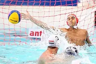 The primary role of the goalkeeper is to block shots at the goal.[25] After saving the ball, the goalkeeper has the responsibility to keep possession of the ball in order to stop opposing players regaining possession.[26] They must make sure that whenever the opposition appears to be ready to make a shot on goal, their hands are near or above the surface of the water.[27] They also possess the job to pass down the pool accurately to retain possession of the ball,[28] often starting the team's counterattack.[29]