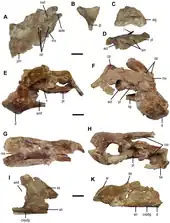 Additionally, a unique combination is present of traits that in themselves are not unique. The part of the dentary in front of the large outer side opening is horizontally elongated. The dentary lacks a lower branch at the front, contributing to the symphysis. A separate coronoid bone is present. On the thighbone the minor trochanter is separated from the major trochanter by a clear cleft.[1]