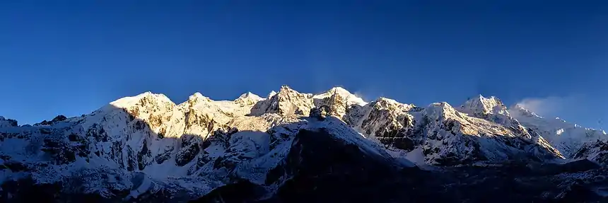 Goecha La (el. 4940 mt or 16,207 ft) is a high mountain pass in Gyalshing district, Sikkim, India in the Himalaya range. The southeast face of Kanchenjunga, the world's third highest mountain, can be viewed from the pass, which is also a base camp for those aspiring to scale the mountain. They say that when the government authorities first saw the view from Goecha La, they were so moved by the view that they decided to feature it on the Rs.100 note.[1]