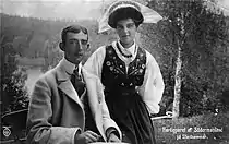 From Peterhof, Maria Pavlovna went to Grand Duchess Elisabeth's rural estate Ilinskoe, near Moscow, where Wilhelm joined them for a month before he left on a cruise to the United States.[14] The young couple maintained their intimacy through letters.[14] Maria imagined herself in love: "It’s lovely to have somebody, even far away, who love you more than anything and whom you love more than everybody on earth“, she wrote to him.[15] In October, Wilhelm returned to Russia joining Grand Duchess Maria and her brother Dimitri who introduced the Swedish prince to their father, Grand Duke Paul, who was permitted to come back to Russia for his daughter's wedding set to take place after she turned age 18 the next April.[16] At Wilhelm's departure, Maria wrote to him: " I love you, so much with every day, every hour more and more. I wish it were April now, how lovely it would be".[16] In her book of memoirs, written more than 20 years later, the grand duchess made different claims: "I was using Wilhelm, in a sense, only to obtain my freedom".[17] As the wedding day approached, she began to have doubts and wished to break off the engagement, but Princess Irene of Hesse, who was visiting her sister Grand Duchess Elisabeth Feodorovna, persuaded her otherwise.[18] Soon Maria Pavlovna was again looking forward with enthusiasm to a new life. The wedding took place at Tsarskoye Selo on 3 May [O.S. 20 April] 1908.[18]