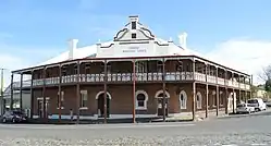 The Grand Western Lodge is a large two storey face brick hotel built in 1901 for John Frape by builder John Wells. Occupying an important site in the centre of town, the Grand Western lodge was built in the hey day of rural development in the district to cater for many visitors, particularly for attending the ploughing demonstrations and competitions. The building is a good example of an Edwardian pub having unusual key hole form windows and pictorial leadlight glazing. The dominant architectural features include the well designed two storey verandah with cast iron balustrading and valance work and the massive stuccoed central parapet.[12][1]