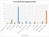 The prominence of agriculture in Great Thurlow was driven by the villagers need to be self-sufficient and led to numerous small farms surrounding the area. Over time trade and new technology has lessened this need for agriculture. Most small farms were absorbed into larger ones and the number of agricultural jobs available consistently decreased.[15] Employment in Great Thurlow is now much more varied, with a relatively small number of people still employed in agriculture. Administration and manufacturing occupations are now as common as agricultural, with construction, retail trade and health/social work having all overtaken agriculture in terms of occupation numbers.[16]
