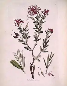 • Grevillea sericea (Sm.) R.Br. subsp. sericea[12] has egg-shaped leaves with the narrower end towards the base, to elliptic or narrowly elliptic leaves, usually less than 30 mm (1.2 in) long, 3–9 mm (0.12–0.35 in) wide, and deep to pale pink or white flowers usually mostly above the foliage.[13][14]