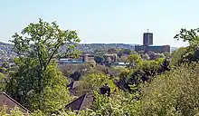 Where to put the cathedral for the new diocese of Guildford was a vexing question until Richard, Lord Onslow donated 6 acres (2.4 ha) atop Stag Hill — so named because the Kings of England used to hunt there. Its solid red brick outline is visible for miles around. Whilst in 1932 this was far outside the town of Guildford, the growth since then has already begun to wrap around the cathedral to the west and south. Guildford Cathedral shares Stag Hill with the main campus of the University of Surrey.