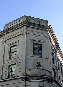 136 Gower Street was the best-known location, and housed sales and the reading library. The current Lewis Building was erected in 1930–31. The name “Lewis’s” is carved at the top of the building, beneath a clock. It also displays a bronze bust of Hippocrates the "Father of Medicine" by William Aumonier Jr., based on a sculpture held at the British Museum, and presented by the chairman H.L. Jackson and his wife.[9][10] The building is now part of University College London.