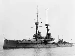 - ↑ Sources disagree on the number, type and composition of the secondary armament. Burt gives only eighteen 4-inch guns and claims that they were the older quick-firing QF Mark III guns. In addition, he lists a 12-pounder (three-inch (76 mm)) gun.[3] Preston concurs on the number of 4 inchers, but does not list the 12 pounder.[2] Parkes says twenty 4-inch guns; while not identifying the type, he does say that they were 50-calibre guns[5] and Preston agrees.[6] Friedman shows the QF Mark III as a 40-calibre gun and states that the 50-calibre BL Mark VII gun armed all of the early dreadnoughts.[7]