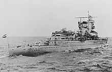 HNLMS De Ruyter (Dutch: Hr.Ms. De Ruyter) was a light cruiser of the Royal Netherlands Navy. She was originally designed as a 5,000 long tons (5,100 t) ship with a lighter armament due to financial problems and the pacifist movement. Later in the design stage, an extra gun turret was added and the armor was improved. She was the seventh ship of the Dutch Navy to be named after Admiral Michiel Adriaenszoon de Ruyter.