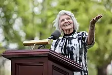 Harriet Fulbright served as an "unofficial ambassador" for the Fulbright Program and was often invited to speak at events that range from university commencements to milestone anniversaries for Fulbright Commissions around the world who are celebrating the presence of her late husband's educational exchange program in their respective countries.[5][6] As a result of her status as an international figure of peace and education, she received many awards and honorary degrees.[7] She sat on the advisory board of the Alliance for Peacebuilding. In 2006, she created the J. William & Harriet Fulbright Center, a nonprofit dedicated to promoting peace through international education and furthering her husband's legacy. Fulbright celebrated her 75th birthday in Washington.