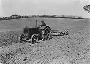 The mould-board plow leaves distinct furrows (trenches) across the field.