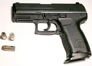 The Heckler & Koch P2000 is a German semi-automatic pistol introduced late in 2001 and intended primarily for law enforcement, paramilitary, and commercial markets. It is based on the USP Compact pistol. The P2000 was designed specifically with improved ergonomic characteristics; it has features that reduce handling related stresses, while at the same time increasing user handling and comfort.