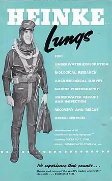 • Mid to late 1950s: the firm starts making "Heinke-Lung"[10] aqualungs, Delta[11] dry suits, Dolphin[12] and Falla[13] wetsuits, Hans Hass diving masks, swimming fins and snorkel tubes.
