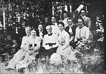 Home economists meeting in 1906; Kinne is in the front row, wearing a striped dress, next to Ellen Swallow Richards (in the black skirt). - (3856195710)