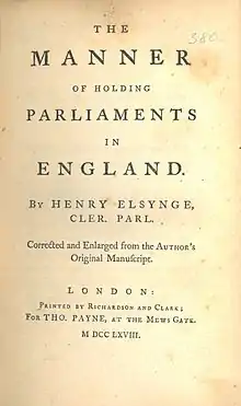 - ↑ Henry Elsynge (1768), Thomas Tyrwhitt (ed.), The Manner of Holding Parliaments in England. By Henry Elsynge, Cler. Parl. Corrected and Enlarged from the Author's Original Manuscript, London: Printed by Richardson and Clark; for Tho[mas] Payne, at the Mews Gate, OCLC 508937999.