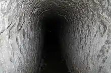 About 750 metres (2,460 ft) east-northeast of the sanctuary, there was a series of massive cisterns, reached by a rock-cut stairway extending about 50 metres (160 ft) down into the bedrock. The opening of the stairway is 64 metres (210 ft) northwest of the openings of the cisterns. The descent is steep and the steps are not all well-preserved. There are cuttings for a parapet wall around the vertiginous upper openings of the cisterns to prevent falls. It has been proposed that the water was raised from the cisterns to the water channel by the use of large human-powered waterwheels.