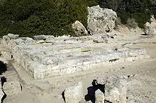 The triglyph and metope altar from the south; beyond the altar is the western end of the L-shaped stoa.