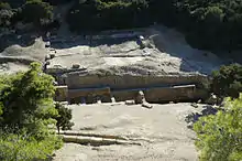 The known structures of the sanctuary cover a rectangle approximately 45 metres (148 ft) northsouth and 245 metres (804 ft) eastwest. The sanctuary wrapped around a small cove and extended toward the east uphill along a ridge. The structures will be discussed in order from west to east.