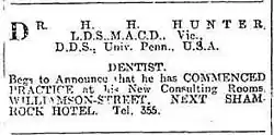 5. Dental Board of Victoria: First Year L.D.S. Course, The Argus, (Thursday, 5 December 1901), p.9; (note that, although the names of others in his cohort appear in the results of the November 1902 examinations for the L.D.S.'s second year, Hunter's name is absent ); Dental Board: Results of Annual Examinations: Third Year L.D.S. Course, The Argus, (Tuesday, 1 December 1903), p.7; Dental Board of Victoria: Fourth Year L.D.S., The Argus, (Wednesday, 7 December 1904), p.8.