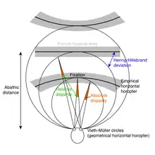 The Hering–Hillebrand deviation describes the mismatch between the theoretical and empirical horopter. The horopter is the set of points that projects at the same location in the two retinae (i.e. that have the same visual direction). Geometrically the horopter is a circle passing through the nodal point of the two eyes and through the fixation point. This is known as the horizontal geometrical horopter, or as the Vieth–Müller circle. This is the set of points that correspond geometrically to the intersection between visual lines at identical eccentricities. There is also a vertical horopter which is a straight line on the sagittal plane and passing through the intersection between the sagittal plane and the Vieth–Müller circle (typically fixation if the observer fixates straight ahead, but not necessarily).[1][2]
