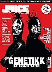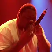 Rapping (also known as emceeing,[107] MCing,[107] spitting (bars),[108] or just rhyming[109]) refers to "spoken or chanted rhyming lyrics with a strong rhythmic accompaniment".[110] Rapping typically features complex wordplay, rapid delivery, and a range of "street slang", some of which is unique to the hip hop subculture. While rapping is often done over beats, either done by a DJ, a beatboxer, it can also be done without accompaniment. It can be broken down into different components, such as "content", "flow" (rhythm and rhyme), and "delivery".[111]