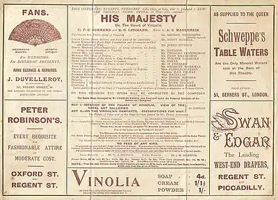 The piece was expected to draw the public solely on the strength of the return of George Grossmith after an absence of almost a decade from the Savoy Theatre. Grossmith was well and fondly remembered for his creation there of the comedy roles in the famous series of Gilbert and Sullivan operas, and during his years away, he had become the most popular solo piano entertainer in the country.[3] The Savoy audience was eager to see him perform together on stage with his successor in the Savoy opera roles, Walter Passmore. Rehearsals began in December 1896, an unusually long rehearsal period for the Savoy, but Mackenzie later recalled that even the company felt that the work was not wanted.[4] London's leading stage director, Charles Harris, was engaged, but he died a few days before the opera premiered, leaving the Cartes to finish his work. Richard D'Oyly Carte took ill, leaving the final arrangements to his wife, Helen. The Savoy's usual choreographer, John D'Auban arranged the dances.