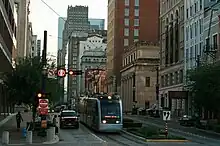 Houston light rail train traveling north, approaching the Main Street viaduct