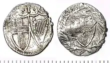 The Commonwealth of England (1649–60) is well known for having produced the only English coins which did not contain any Latin inscription at all. This was due to an association of Latin with Catholicism.[1] As far as the Commonwealth penny is concerned, the inscriptions are totally absent. The reverse shows St George's shield within a wreath, while the obverse shows St George's shield and an Irish shield, with the denomination I above them.