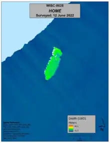 Several newspapers gave an incorrect location for the collision, and Home′s wreck was not discovered until April 1981.[2] It lies in 165 to 170 feet (50 to 52 m) of water about 10 nautical miles (19 km; 12 mi) southeast of Manitowoc at 43°56.932′N 087°33.211′W / 43.948867°N 87.553517°W.[2][3] Added to the National Register of Historic Places on December 28, 2010,[4] the shipwreck site was included within the boundaries of the Wisconsin Shipwreck Coast National Marine Sanctuary[5] when it was created in 2021.[6][7][8]