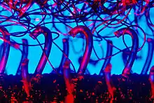 Velcro jumping is a game where people wearing hook-covered suits take a running jump and hurl themselves as high as possible at a loop-covered wall.[8][17] The wall is inflated, and looks similar to other inflatable structures. It is not necessarily completely covered in the material—often there will be vertical strips of hooks. Sometimes, instead of a running jump, people use a small trampoline.