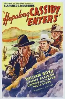 Hop-Along Cassidy (reissued as Hopalong Cassidy Enters) is a 1935 American Western film that features the character Hop-Along Cassidy created by writer Clarence E. Mulford. This is the first of 66 Hopalong Cassidy films produced between 1935 and 1948 and all starring William Boyd in the title role. William Boyd was originally offered the role of Buck Peters, the ranch foreman, but he decided to take the role of Hop-Along instead.
