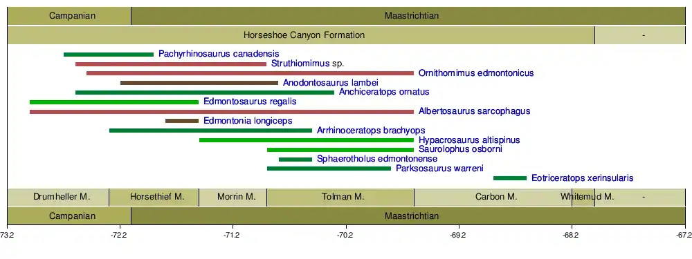 - ↑ Eberth, David A.; Kamo, Sandra L. (October 2020). "High-precision U–Pb CA–ID–TIMS dating and chronostratigraphy of the dinosaur-rich Horseshoe Canyon Formation (Upper Cretaceous, Campanian–Maastrichtian), Red Deer River valley, Alberta, Canada". Canadian Journal of Earth Sciences. 57 (10): 1220–1237. doi:10.1139/cjes-2019-0019. ISSN 0008-4077.