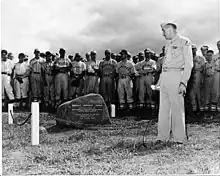 He joined the United States Marine Corps in 1942 and became an officer. In addition to seeing combat with the 4th Marine Division, he played for a service football team in Maui, Hawaii.[2] He served with I Company, 3rd Battalion, 23rd Marines through the battles of Kwajalein, Saipan (earning a Silver Star), and Tinian.[3] On February 19, 1945, 1st Lieutenant Johnson was killed in action by a mortar shell at the Battle of Iwo Jima and awarded a second Silver Star posthumously; he was one of three former NFL players to die on Iwo Jima along with Jack Chevigny and Jack Lummus. Johnson was buried at the National Memorial Cemetery of the Pacific in Honolulu on February 2, 1949.[2]