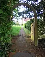 Howgills was built on South View in 1907 to a free-style Arts and Crafts design by Robert Bennett (1878–1956) and Benjamin Wilson Bidwell (1877–1944), typical with this firm of architects,[2] although it is thought the design is mostly by Bidwell, a Quaker himself.[3] Associates of Parker & Unwin who were closely connected with the Garden City Movement, Bennett and Bidwell opened an office in Letchworth in 1907 and over the next thirty years went on to design many distinctive buildings in the town.[4] The construction was undertaken by local builders Palmer & Ray. The Meeting House with its large, galleried wood-panelled central meeting room is based on Briggflatts in Cumbria and was named after the Howgill Fells that surround that hall.[5] The building is of two storeys with an irregular façade of three bays with a projecting entrance in the centre bay with a gable roof. The brick chimneys stacks are tall with moulded caps, while the stack on the front façade has weathered offsets. The walls have a roughcast surface while the casement windows with leaded lights sit within stone surrounds. The entrance arch is recessed and has boarded double-doors. The carved timber inscriptions over the entrance hall and meeting room fireplaces are apparently early work by Eric Gill.[4] The decorative copper plaque in the porch is in the Art Nouveau style and reads: "THIS BUILDING ERECTED 1907 IS THE GIFT OF JULIET RECKITT TO THE SOCIETY OF FRIENDS".[1]