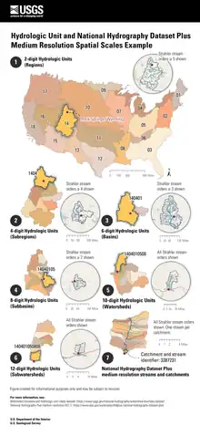 This article incorporates text from this source, which is in the public domain. - ↑ "Overview and History of Hydrologic Units and the Watershed Boundary Dataset (WBD)". Natural Resources Conservation Service. 11 January 2022. Archived from the original on 24 July 2011. Retrieved 18 March 2023.