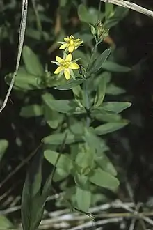 The flowers are solitary or arranged in simple cymes. The cymes are naked save for the linear bracts. Branches of the inflorescence are divergent and form a somewhat corymbiform shape. The five linear-lanceolate sepals are blunt to acutish, measuring 2.5-4.5 mm long and 0.8–1 mm wide. The sepals are shortly united at their base with one being longer than the others. The five-veined yellow petals are oblong to oblanceolate and have rounded tips, measuring about as long as the sepals or shorter. The fifteen stamens are arranged in three loose fascicles. Both the filaments and anthers are yellow, the anthers being globose and about 0.25 mm wide. The ovoid, yellow pistil is 2 mm long, with indistinct carpels and one locule. The three styles are 0.25 mm long. The conical capsule is red or purplish, measuring 4–6.5 mm long and 2-2.5 mm wide.[6] The capsule has persistent styles measuring about 0.5 mm long. The light brown and cylindrical seeds have conical or rounded ends, measuring 0.6 mm long.[7] The herb flowers and fruits from late July to early September.