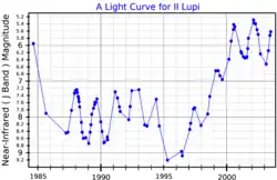 On the basis of infrared photometry,[11] IRAS 15194-5115 was given the variable star designation II Lupi in 1995, although the variability type was still unknown.[12] More detailed infrared photometry confirmed that II Lupi was a Mira variable and showed regular variations with a period of 575 days over 18 years. The mean magnitude also dimmed and brightened during that time and has been characterised as a 6,900-day secondary period although less than a full cycle was observed. The secondary period could be interpreted as an isolated or irregular obscuration event in a dust shell surrounding the star.[13]
