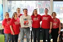 The proposal was supported by all major Democrats at the city and state level. Aside from the mayor and Democratic city councilors, the proposal was supported by Marion County Prosecutor Ryan Mears, Indianapolis Metropolitan Police Department Chief Randall Taylor, Marion County Sheriff Kerry Forrestal, and Corporation Counsel Matt Giffin.[23] Giffin, the city/county lawyer who would be responsible for invoking the law if it becomes enforceable, defended its constitutionality by describing it as a trigger law to go into effect if the state legislature or the courts allowed it.[23] At each hearing, a large contingent of Moms Demand Action Indianapolis activists in red shirts sat in the gallery and spoke in support of the proposal.[27]