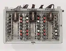 Early electronic computers such as Colossus made use of punched tape, a long strip of paper on which data was represented by a series of holes, a technology now obsolete.[20] Electronic data storage, which is used in modern computers, dates from World War II, when a form of delay-line memory was developed to remove the clutter from radar signals, the first practical application of which was the mercury delay line.[21] The first random-access digital storage device was the Williams tube, which was based on a standard cathode ray tube.[22] However, the information stored in it and delay-line memory was volatile in the fact that it had to be continuously refreshed, and thus was lost once power was removed. The earliest form of non-volatile computer storage was the magnetic drum, invented in 1932[23] and used in the Ferranti Mark 1, the world's first commercially available general-purpose electronic computer.[24]