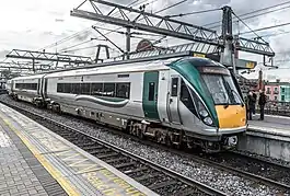 InterCity services are operated using a mixture of locomotive pulled coaching stock and DMUs. In 2006, deliveries began of 67 new Mark 4 coaches, specifically for the flagship Dublin-Cork route, in an order costing approximately €117 million. These are formed into 8 carriage trains, pulled by a 201 class locomotive, and operate an hourly service between Cork and Dublin. The entry into service of the Mark 4 stock allowed the Mark 3 coaching stock to be cascaded to other routes, allowing in turn the withdrawal of the elderly "Cravens" and Mark 2 coaches. In 2007, the first of a total 183 coaches of the new 22000 Class diesel multiple unit were delivered, of which 150 vehicles are for InterCity services, the remaining for use on Commuter routes, at a total cost of approximately €400 million. These trains, which are in 3-car, 4-car and 5-car formations, replaced the Mark 3 coaches formerly in use on the routes between Dublin and Limerick, Galway and Waterford and the 2800 Class and 29000 Class DMUs on the Dublin to Sligo and Dublin to Rosslare Europort services, and on the services that do not terminate in Dublin. The Commuter DMU rolling stock was then transferred to the expanded Commuter services from 2008 until 2012, when all 22000 Class DMUs had entered service. The first 22000 Class train entered service on 18 December 2007 on the service to Sligo.[1] These DMUs now operate all Dublin-Sligo, Dublin-Tralee and Dublin-Limerick services, as well as all Dublin-Westport services and Dublin-Galway, Dublin-Waterford and Mallow/Cork-Tralee services. The final deliveries of the 22000 Class took place in 2012. As of 2016 all InterCity and many Commuter routes are operated with 22000 Class units, with the exclusion of most Cork-Dublin and Belfast-Dublin services.