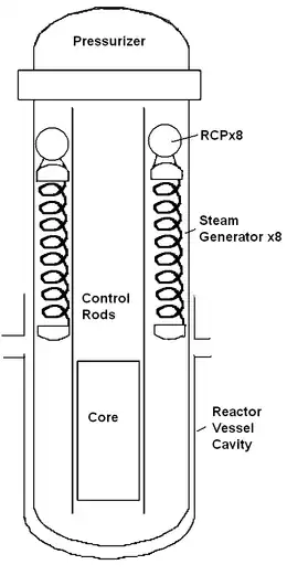 The coolant system consists of a pressurizer, Steam generators, and reactor coolant pumps (RCPs). These are all located within the reactor pressure vessel, making a very small, short loop that forms the primary coolant system, see the figure on the right for the relative locations of the components.