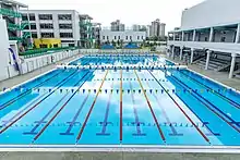 The Ampang campus, which began use from August 2018, is set on approximately 10 hectares (25.7 acres) in Ampang Hilir.[26] The campus has state-of-the-art facilities catering to both athletics and the arts. Athletic facilities include: an indoor fitness center, an Olympic-sized track; three sports fields; an Aquatic Complex including a 50-metre Olympic-sized swimming pool built accredited by FINA,[27] two gyms, an indoor climbing wall, tennis courts and playgrounds.[28][29] Arts facilities include The Dr. Norma J. Hudson Amphitheater, the Robert B. Gaw Theater and the Melawati Theater: available for student meetings, music recitals, presentations, plays and other arts-centric performances;[30][31] ISKL's 'green' facility is the first International school in Malaysia to achieve platinum Green Building Index (GBI) status with environmentally sustainable concepts.[32][33]