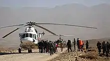 In response to the crash, crisis centres were set up in Tehran, Isfahan, Fars and Yasuj.[8] Weather conditions at the crash site, including snow and strong winds, were hampering search and rescue services.[6] The Red Crescent Society announced that a drone would be flown to the area due to the severe weather condition which prevented helicopters to reach the crash site. Search and rescue team announced on 19 February that at least 5 helicopters had been prepared for the search operation.[17] Troops with search dogs were deployed to hike the mountain and to search the area on foot. Search and rescue operation via air was stopped for the second time due to bad weather conditions.[18] Reports that the wreckage had been found at an elevation of 11,482 feet were refuted by officials from the Iranian Red Crescent and Iranian investigators.[19][20]