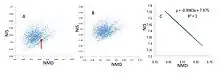 In 2011 Roman Zubarev formulated the isotope resonance hypothesis.[1][2] It originated in the following, unexpected observation. Define ΔMm = Mmono - Mnom, where Mmono is the monoisotopic mass (e.g. O = 15.994915 Da) and Mnom is the nominal (integer) mass, i.e., the number of nucleons (e.g. 16O = 16). ΔMm is a constant in the whole Universe. Define ΔMis = Mav - Mmono, where Mav is the average isotopic mass (e.g. O = 15.999 Da on Earth). Obviously ΔMis depends on the precise isotopic composition for a given molecule. Finally define NMD = 1000ΔMm/Mnom and NIS = 1000ΔMis/Mnom, where NMD [in units of ‰] and NIS [in units of ‰] are the normalized isotopic defect and shift, respectively. If NIS is plotted as a function of NMD for a large number of terrestrial peptides, one would anticipate a homogenous distribution of data points (as in Fig. 1B). This is not what was found by Zubarev's team,[1] instead they found band gap in the distribution with a narrow line in the middle (Fig. 1A).