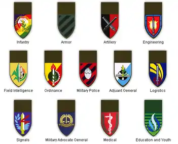 The service uniform for all ground forces personnel is olive green, navy and air force uniforms are beige.[4] The uniforms consist of a shirt, trousers, beret neatly placed under epaulet, belt and boots. Additionally a bomber jacket and sometimes a sweater are issued to optionally be worn during cold weather. Sailors are additionally issued all-white dress uniform for ceremonies. Field dress consist of olive green fatigues, the same uniform is used for winter and summer, and heavy winter gear is issued as needed.[4] Women's dress parallels the men's but a woman may choose to substitute a skirt for the trousers, or sandals for boots. NCOs and Officers with the rank of Captain or above wear different dress uniforms depending on the branch. Ground forces wear light teal shirts and dark green pants, in the Air Force light blue shirts and navy blue pants, and in the Navy white shirts and navy blue pants. Depending on position Officers with the rank of Captain and above may additionally substitute their boots for oxford dress shoes.